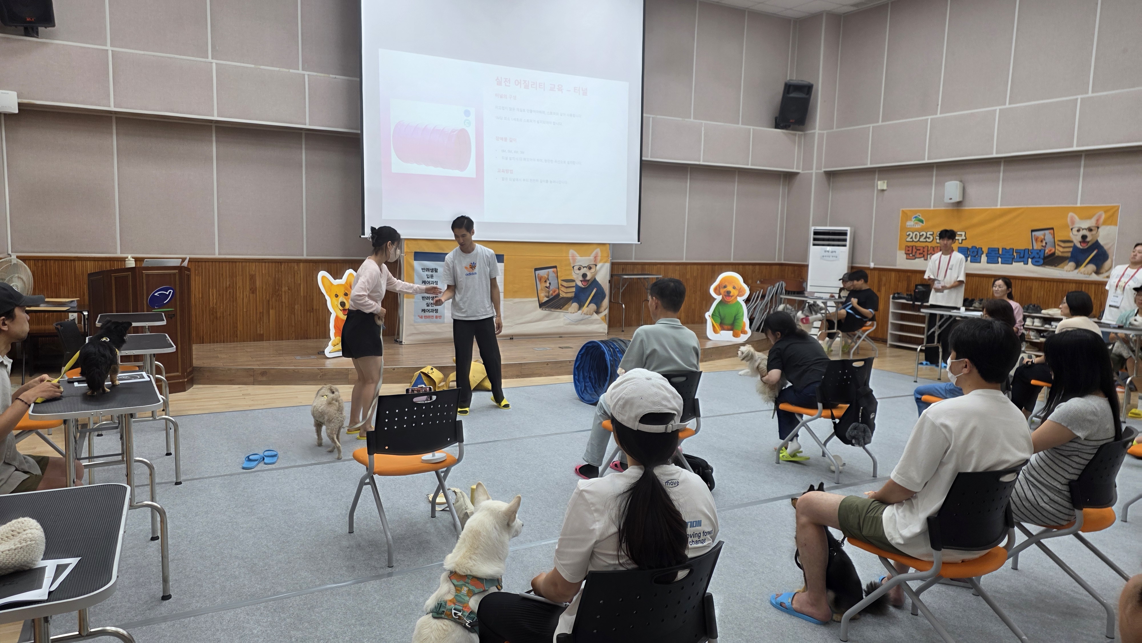 ▲실전 돌봄 과정 (진관동, 녹번동) : 반려견과 함께 참여하는 실습형 프로그램으로, 산책 훈련, 도그스포츠 체험, 응급처치법, 위생 미용 실습 등 실생활에 유용한 교육을 제공하며, 회차별 20명으로 소규모로 운영됩니다.