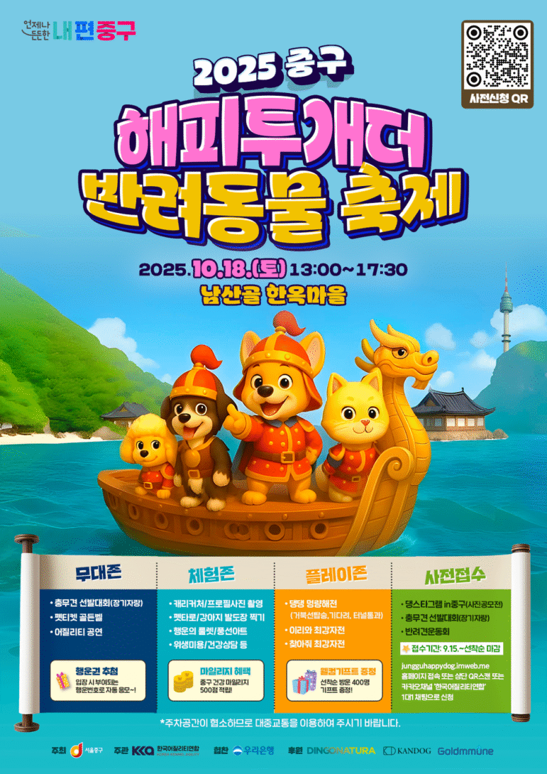 서울 중구 남산골 한옥마을에서 펼쳐지는 ‘2025 해피투개(dog)더’ 반려견 축제는 이번에 3회째를 맞이했다. 이번 축제는 ‘충무공 이순신 탄생지, 중구’의 의미를 더해 용맹과 지혜, 교감을 담은 다채로운 프로그램으로 꾸며진다.