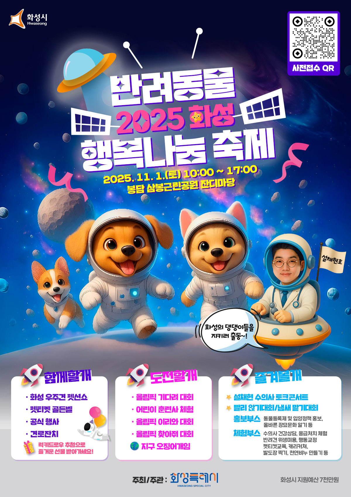 행복한 반려문화를 나누는 화성특례시의 대표 행사. 2025년에는 화성의 댕댕이들을 위한 "우주대탐험" 컨셉으로 봉담 삼봉근린공원 잔디마당에서 성대한 축제가 펼쳐집니다.