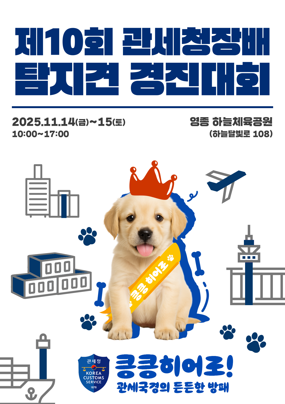 2007년부터 2년마다 개최하는 탐지견 경진 대회는 2025년 개최 20주년을 맞아 기존 기관부·학생부 경진대회에 더해 일반 국민도 참여할 수 있는 체험형 국민 축제로 치뤄집니다. 급증하는 마약 범죄의 심각성과 관세청의 국경수호 역할을 널리 알리기 위해 마약적발 사례 전시, 마약 관련 VR 체험 및 '탐지견의 일생' 사진전, 은퇴견 민간분양 안내부스 등이 운영됩니다. 관람과 참여는 사전 신청 없이 행사 기간 중 현장방문으로 가능합니다.